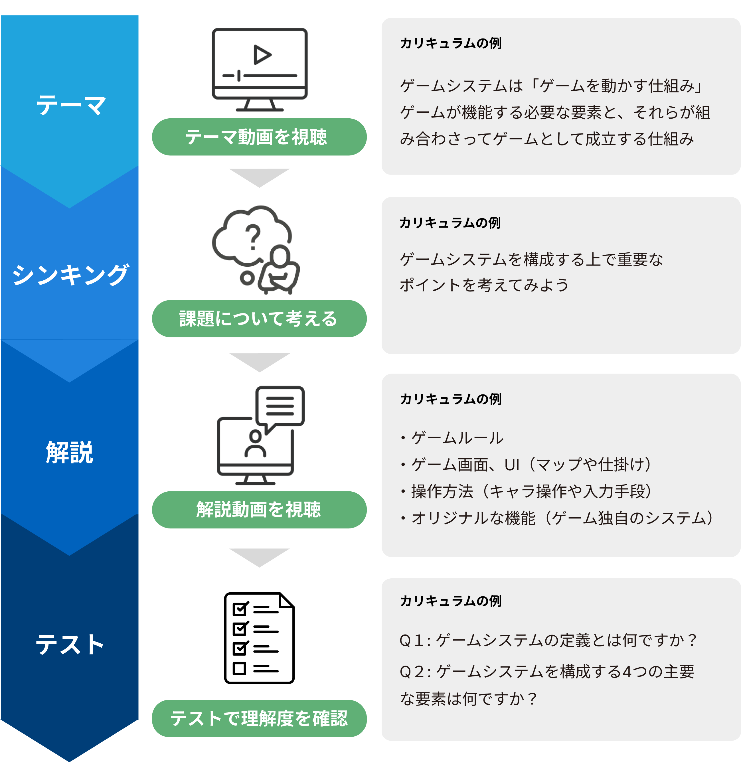 自発的な理解と解決策を導き出す学習フローを採用しています。テーマごとにアウトプットを行い解説とテストで理解度を高めることができます。